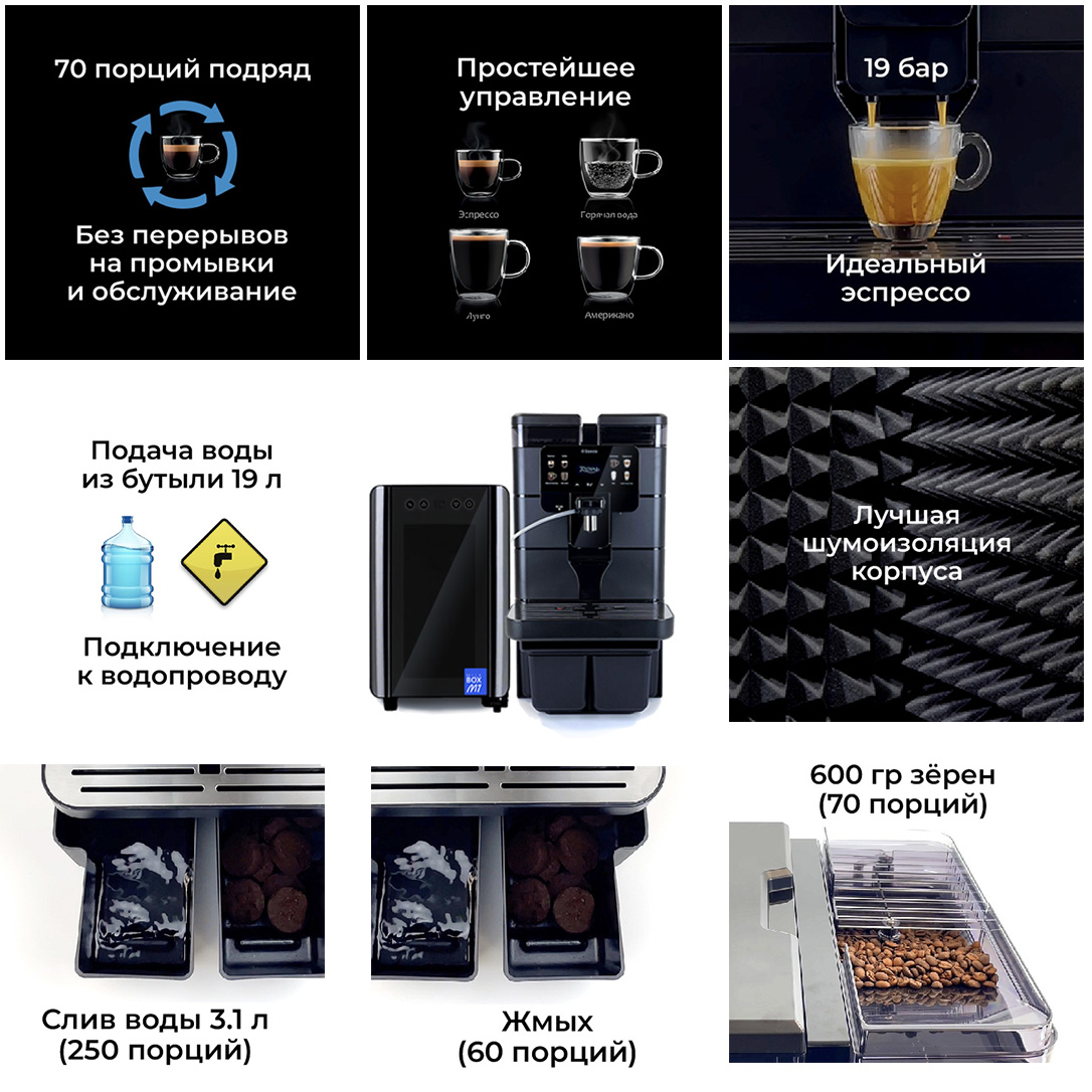 - Ёмкости для отходов: Увеличенные контейнеры для отработанного кофе и слива воды снижают частоту обслуживания.